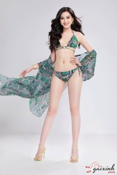 Bộ bikini có họa tiết da rắn đem lại vẻ sexy nóng bỏng nhưng tông màu xanh của nó cùng mái tóc xõa dài giúp giữ lại vẻ nền na dịu dàng là nét riêng của Đỗ Thị Hà.